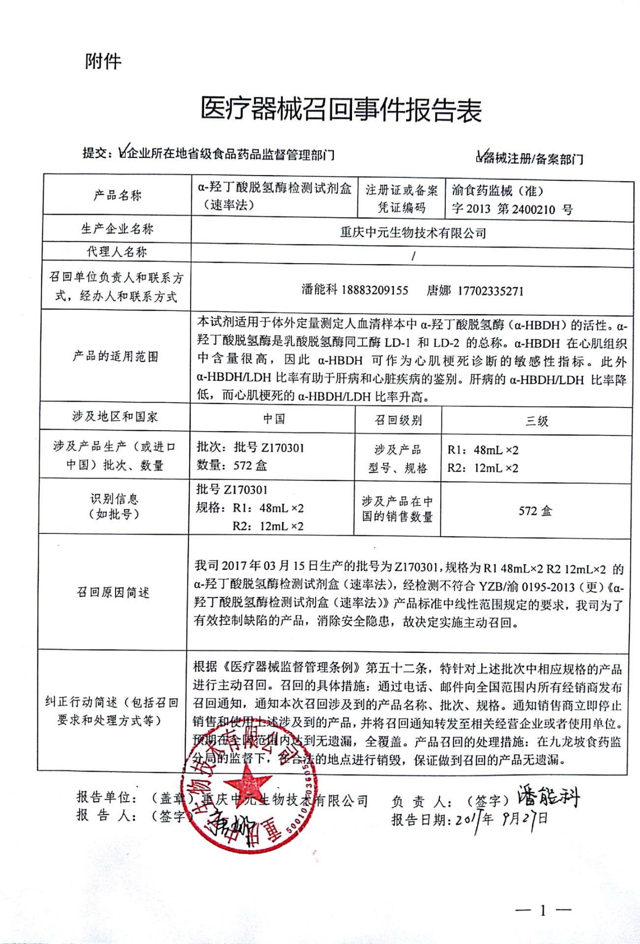重庆中元生物技术有限公司报告,由于企业产品检测项目不符合注册产品标准规定,重庆中元生物技术有限公司对其生产的α-羟丁酸脱氢酶检测试剂盒(速率法)(注册或备案号:渝食药监械(准)字2013第2400210号 )主动召回。召回级别为三级召回。涉及产品的型号、规格及批次等详细信息见《医疗器械召回事件报告表》。