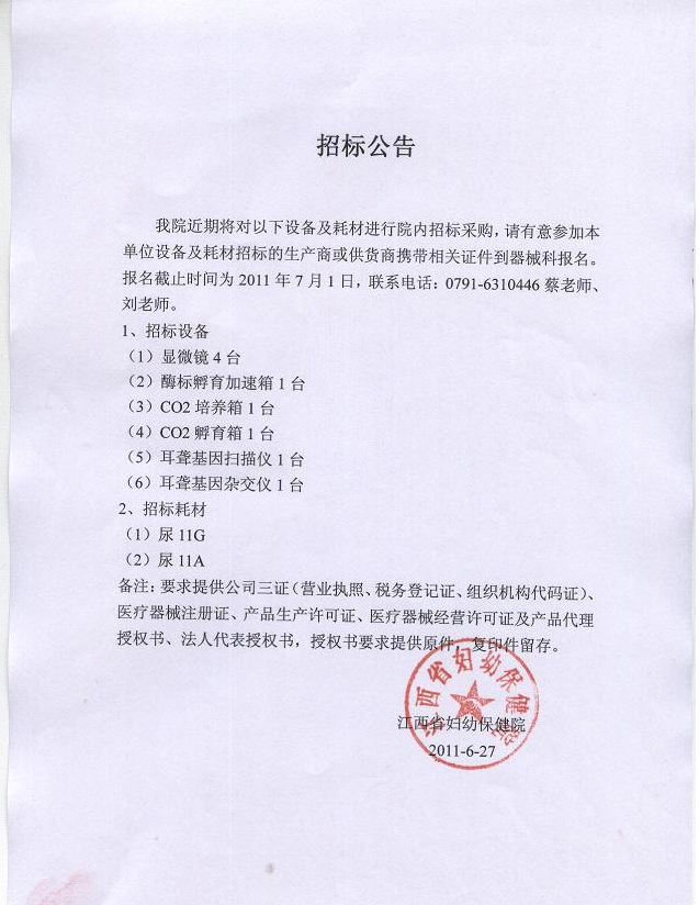 江西省妇幼保健院设备及耗材采购招标公告