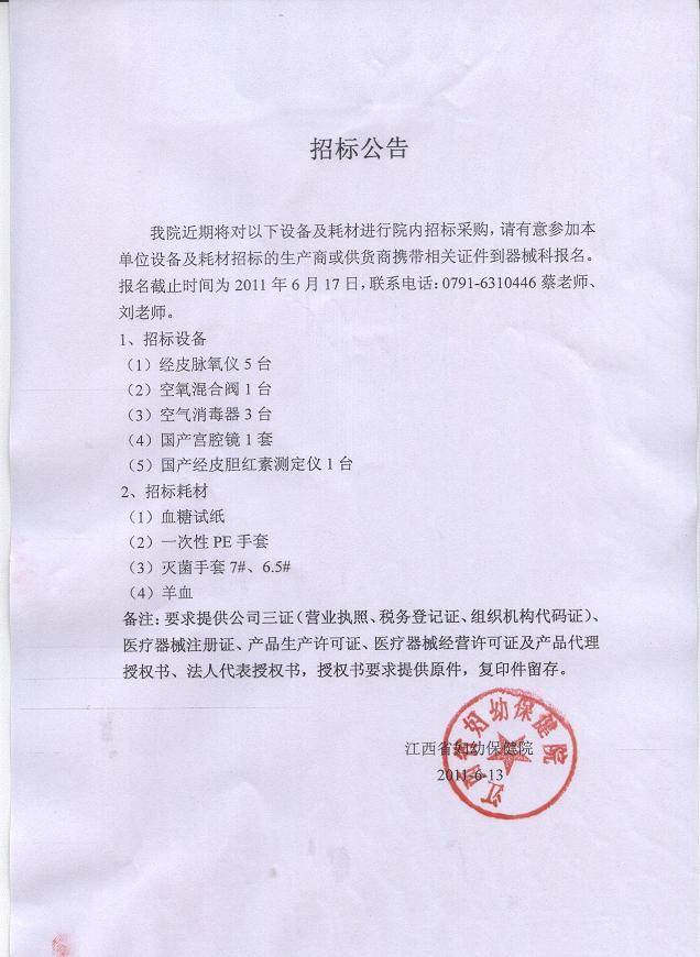 江西省妇幼保健院经皮脉氧仪等设备及耗材招标公告